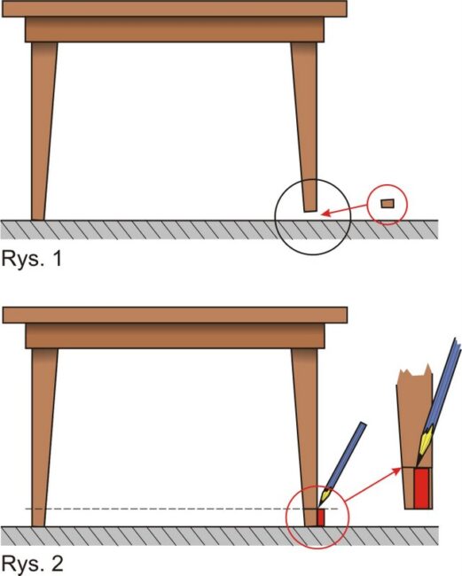 Często się zdarza, że mamy do czynienia z kołyszącym się stołem. Przyczyną tego może być nierówna podłoga. W takim przypadku najczęściej pomagamy sobie podkładką pod jedną z nóg (Rys 1). Najlepiej uformowaną z cienkiej sklejki, trwale przyklejoną do przetartej papierem ściernym spodniej powierzchni nogi. Taki sposób ma zastosowanie wtedy, kiedy tylko jedna z nóg jest krótsza. Błędem jest przycinanie trzech pozostałych nóg stołu. Można to zrobić, jeżeli zależy nam na obniżeniu jego wysokości.