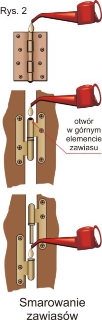 ● drzwi przy otwieraniu i zamykaniu skrzypią – zawiasy należy posmarować olejem technicznym; niektóre czopy zawiasów są przystosowane do okresowego smarowania, wystarczy wówczas wpuścić parę kropel oleju (najlepiej zmieszanego z grafitem) do przewidzianego do tego celu otworu w urządzeniu (Rys.2); w kolejności czynności: kilkakrotnie otworzyć i zamknąć drzwi, aby środek smarujący mógł się dobrze rozprowadzić w zawiasach i zetrzeć spływający ewentualnie po ich zewnętrznych powierzchniach nadmiar oleju;