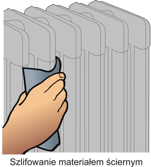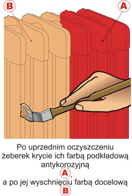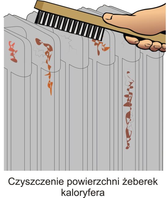 Niewielkie ślady korozji można usunąć środkami chemicznymi (do nabycia w marketach budowlanych lub z artykułami chemicznymi). W przypadku użycia któregoś z nich, należy dokładnie przestrzegać zapisów jego instrukcji stosowania. Bardziej skorodowane elementy trzeba oczyścić sposobem mechanicznym. Duże ilości rdzy, popękaną na niej warstwę farby można w pierwszej kolejności robót odbijać delikatnie młotkiem, w następnej czyścić szczotką drucianą. Ostatnimi czynnościami przygotowawczymi do krycia powierzchni kaloryferów farbą docelową są: a) szlifowanie ich ściernicą (płótno ścierne lub szlifierka elektryczna, tarczowa), zrazu gruboziarnistą, później drobnoziarnistą (wygładzanie), b) usuwanie pyłów szczotką włosianą, lepiej odkurzaczem, zmycie mocno ciepłą wodą, dokładne osuszenie. Jest wskazane, aby pierwszą warstwą kryjącą oczyszczoną powierzchnię grzejników żeliwnych była farba podkładowa antykorozyjna. Dopiero po jej powłoce można malować wybranym kolorem farby zewnętrznej – co najmniej dwukrotnie.