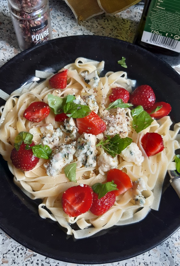 Tak, to są pokrojone truskawki oraz pokruszony ser pleśniowy, najlepiej sprawdza się gorgonzola. Z wierzchu skrapiamy wszystko oliwą i posypujemy pieprzem. Ja dałam aromatyczny i pikantny pieprz syczuański z młynka (Aniu, dziękuję!).