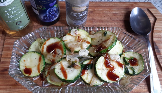 Cukinię umyć, osuszyć, pokroić w półcentymetrowe krążki. Obsmażać w rozgrzanej oliwie razem z ziołami i drobno posiekanym czosnkiem. Pod koniec, po odwróceniu, posolić i popieprzyć. Wyłożyć na salaterkę, jeszcze ciepłą skropić octem z białego wina. Po przestygnięciu skropić octem balsamicznym i posypać świeżymi ziołami.
