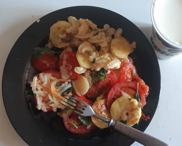 Kto chce, może podać ją z ugotowanym makaronem (resztki, resztki!), odgrzanym z cebulką i plasterkami, a jakże, cukinii).