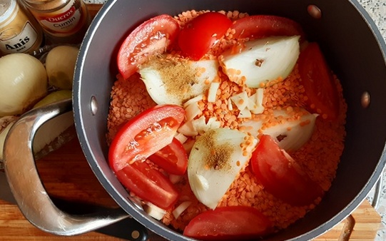 Soczewicę opłukać. Dwie cebule pokroić w plastry, pokroić pomidory (warto je zblanszować i obrać ze skóry), posiekać czosnek.