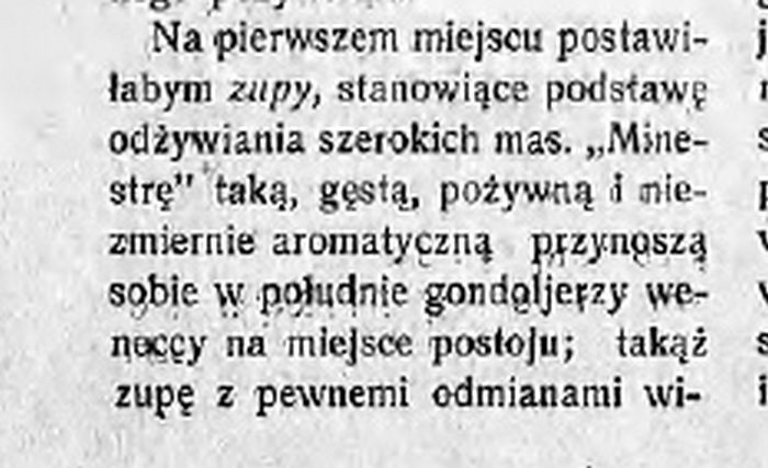 Takie zupy to są właśnie minestry. Na zakończenie poczytajmy, jak opisała je w przedwojennym tygodniku dla kobiet żydowskich „Ewa” któraś z podróżniczek po Italii z lat 30. XX wieku.