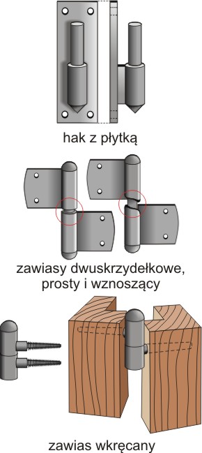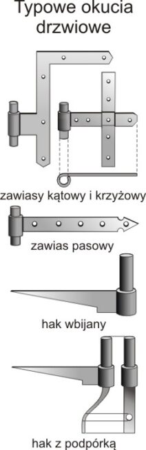 Okucia drzwiowe w miarę możności są tak zakładane, aby większa ich część była wpuszczona w drewno. W drzwiach piwnicznych, czy np w szopach, z reguły zawiasy mocuje się z wierzchu, po ich wewnętrznej stronie. Do niektórych ważniejszych, bardziej powszechnie stosowanych rodzajów zawiasów należą: zawiasy kątowe (nadające się do cięższych skrzydeł), krzyżowe (mocowane głównie jako trzecie, dodatkowe przytwierdzenie skrzydeł w środku ich wysokości – przy cięższych konstrukcjach), pasowe (nadające się do prostych drzwi, np. bram garażowych lub ogrodowych), haki do zawiasów, stanowiących ich dopełnienie, zawiasy dwuskrzydełkowe czopowe (używane powszechnie w drzwiach pokojowych i oknach drewnianych). Zawiasy dwuskrzydełkowe samowznoszące, stosuje się do mocowania skrzydeł drzwiowych mogących się przesuwać bezkolizyjnie, np. nad dywanami. Zawiasy wkręcane najczęściej są wykorzystywane w meblarstwie. W handlu znajdują się następujące rodzaje zawiasów typowych: a) pasowe, z hakami przykręcanymi wkrętami, b) pasowe, z hakami wbijanymi, zaopatrzonymi w podpórkę, c) pasowe, z hakami wmurowanymi, rozdwojonymi na końcu\ach, d) dwuskrzydełkowe,wpuszczane lub przykręcane, e) dwuskrzydełkowe splatane, f) wahadłowe przykręcane, nadające się do drzwi wahadłowych, jedno lub dwuskrzydłowych, g) narożnikowe z hakami wbijanymi, zaopatrzonymi w podpórki. Oczywiście, jest jeszcze więcej rodzajów podobnych okuć drzwiowych, są bardziej skomplikowane w swojej budowie, przeznaczone do ciężkich, czy też nietypowych skrzydeł.