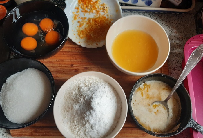 Jajka utrzeć z cukrem aż zbieleją, pod koniec dodać wanilię. Dodać roztopione masło (nie może być gorące), ubijając dodawać po trochu mąkę i proszek do pieczenia. Miksować aż masa zrobi się jednolita. Na końcu wmieszać startą skórkę z owoców (przed ścieraniem skórki, trzeba je staranie umyć lub sparzyć i osuszyć).