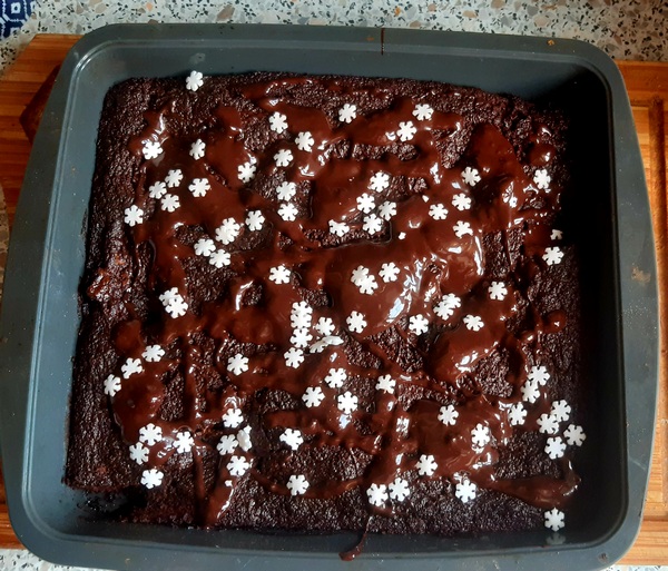 Piec 35–40 min. w piekarniku nagrzanym do 160 st. C. Po wystudzeniu na kratce kuchennej polać karmelowym sosem (lukrem), posypać gwiazdkami.
