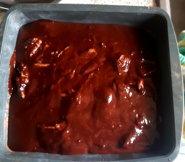Wmieszać posiekane batoniki do czekoladowej masy. Wlać do kwadratowej formy.
