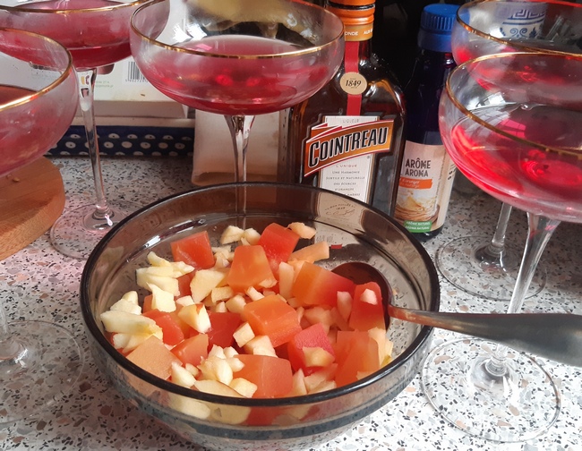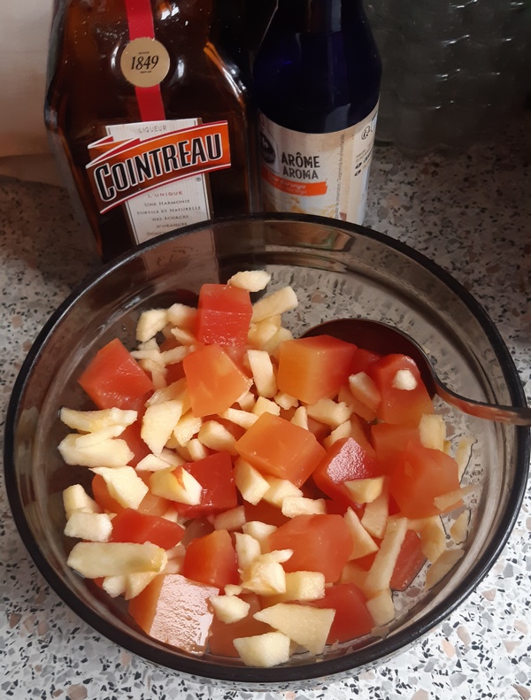 Owoce pokroić (jabłko można zostawić w skórce, jeśli jest ładna), zalać likierem i wodą pomarańczową. Odstawić. W tym czasie sporządzić galaretkę zgodnie z przepisem na opakowaniu. Wypełnić nią dno salaterek czy innych naczynek (np. płaskich kieliszków do szampana).