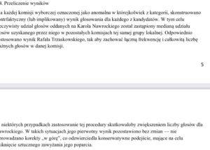 Najbardziej charakterystycznym przykładem był przypadek komisji nr 95 z Krakowa, gdzie „Trzaskowski, który miał w niej w I turze blisko trzykrotnie lepszy wynik niż Nawrocki, w II nie tylko go nie powiększył, ale jeszcze stracił kilkanaście głosów, podczas gdy jego kontrkandydatowi przybyło ich niemal pięciokrotnie” (2). Ten przypadek ilustruje wzór anomalii, który Kontek zidentyfikował w skali całego kraju (3).
