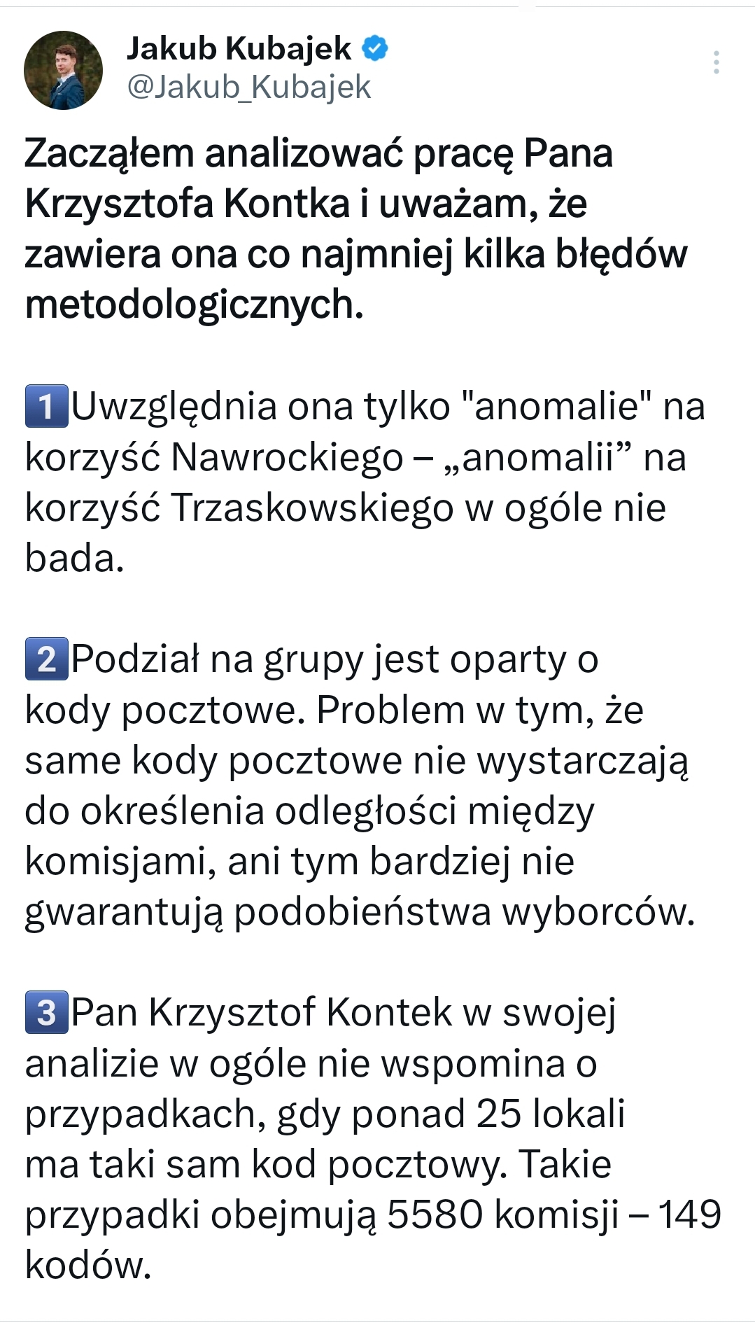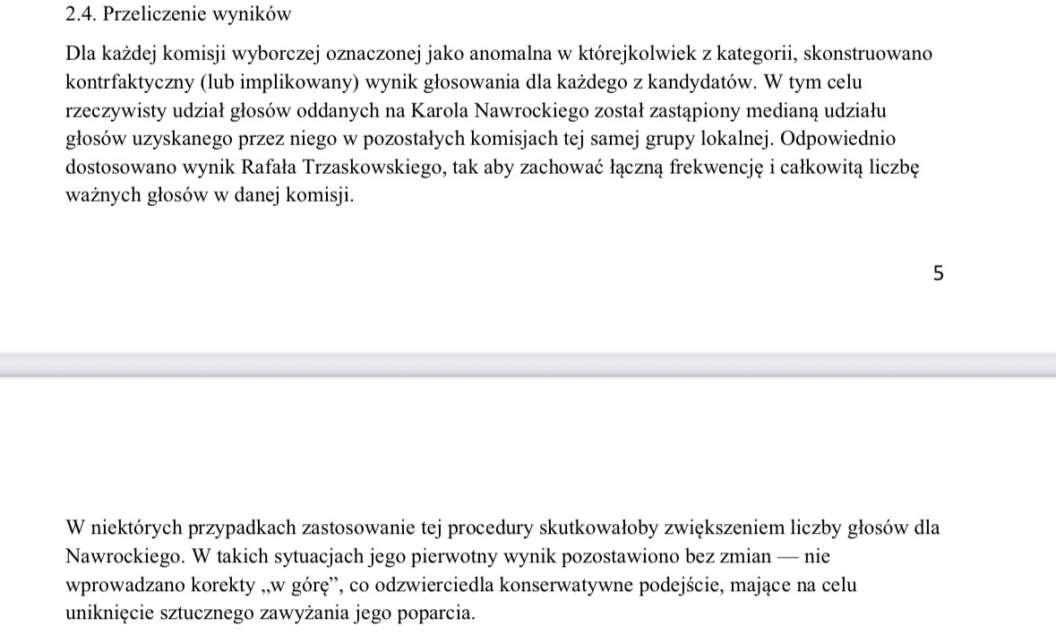 Każda metoda ma swoje słabości, także i ta – o czym napisałem w artykule. Tymczasem z 13 komisji w których SN zlecił przeliczenie głosów, 10 było wytypowanych na podstawie analizy Kontka a wyniki wyszły szokujące. Tylko w tych komisjach na podstawie „cudów przy urnach” Rafał Trzaskowski stracił ponad 2400 głosów na rzecz Nawrockiego. Z przeliczenia głosów wynika, że Kontek nie doszacował ok. 200 głosów sfałszowanych na rzecz NAwrockiego czyli pomylił sie na korzyść Nawrockiego o ok. 18%, co oznacza, że model przyjęty do szacunków jest ostrożny, jak kazda dobra metoda badawcza. Pod tym linkiem można znaleźć całą rozmowę z dr Kontkiem :https://www.youtube.com/watch?v=4LXN2qUPZs0
