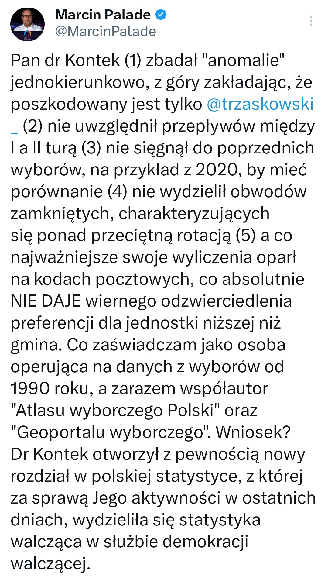 Dla jasności – podałem przykład opinii dr Szulca – zresztą ukazały się również inne, które w sposób odmienny niż dr Kontek analizują takie anomalie. . Tyle i tylko tyle. Uważam, iż takimi analizami powinni zająć się specjaliści od statystyki, a nie dziennikarze i większość elektoratu prezydenta elekta, która nie potrafi policzyć procentu złożonego ( o rozkładzie normalnym nie wspominając, aby się nie narazić na jakąś ustawkę za obrazę) Nadal zgadzam się z opinią prof. Gadacza, że wybór Nawrockiego to upadek demokracji.
