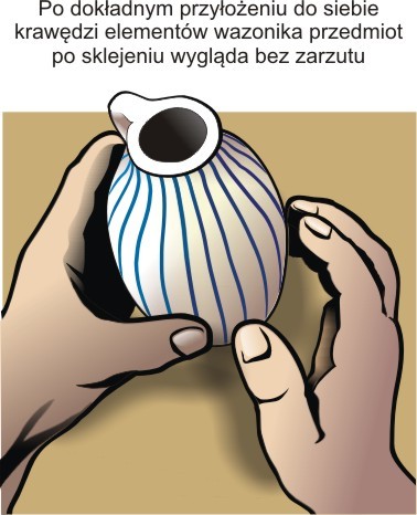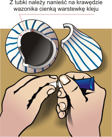 Delikatnie wyciskając z tubki klej, niewielką jego ilość nałożyć trzeba na jedną z łączonych krawędzi wazonu. Po naniesieniu warstewki kleju zdecydowanym ruchem należy złączyć klejone powierzchnie i – starając się nie przesuwać ich względem siebie – unieruchomić na co najmniej 10 sek. Dopiero po upływie tego czasu można zwolnić uścisk i obejrzeć miejsce sklejenia, sprawdzając trwałość wiązania.
