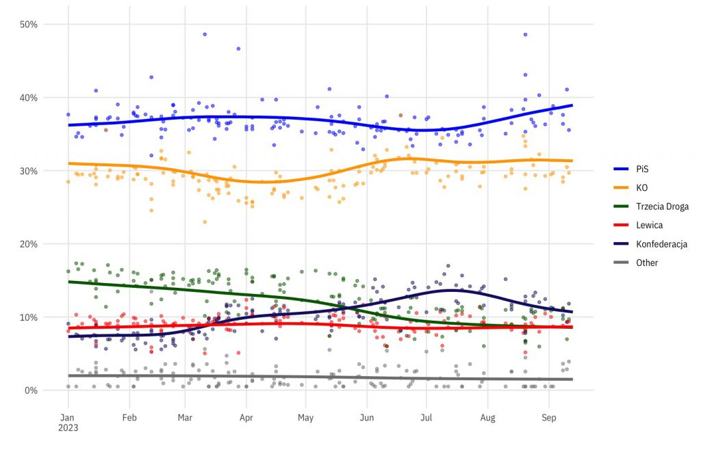 Wyniki sondaży z okresu od stycznia do września 2023 r. wskazują, że PiS prowadzi, KO pozostaje na szarym końcu, a Konfederacja zyskuje na poparciu w Polsce – opracowanie Perplexity AI na podstawie danych źródłowych