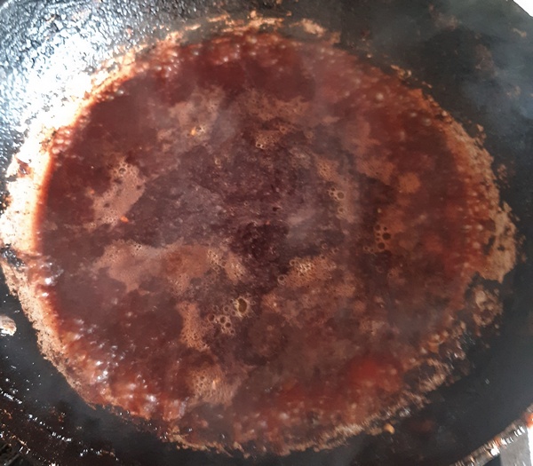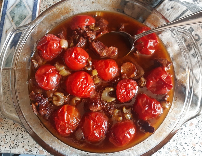 Patelnię zalać czerwonym winem. Mieszając i zeskrobując resztki po smażeniu, zagotować. Zalać mięso z warzywami. Na wierzchu rozłożyć przekrojone na pół pomidorki. Przykryć, wstawić do piekarnika. Zapiekać w 180 st. C przez 30–40 min. zależnie od rodzaju mięsa.
