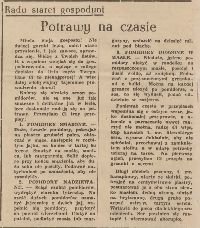 A żeby tradycji stało się zadość w kąciku starej kuchni kierowniczka działu przedstawia garść przepisów wykorzystujących pomidory z roku 1947. Propagowaniem kuchni pasującej do ówczesnych standardów, lecz nie rezygnujących z osiągnięć cywilizacji, zajmowało się „Życie Warszawy”.