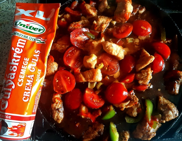 Podobnie można zapiekać mięso z nieco innymi warzywami, łącząc cebulę i pomidory z pokrojoną w paski papryką. Gdy przyprawimy je oryginalną pastą do gulaszu (lub podobną pastą paprykową), otrzymamy rodzaj węgierskiego gulaszu.