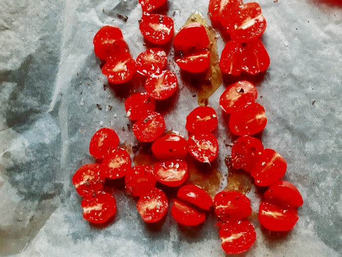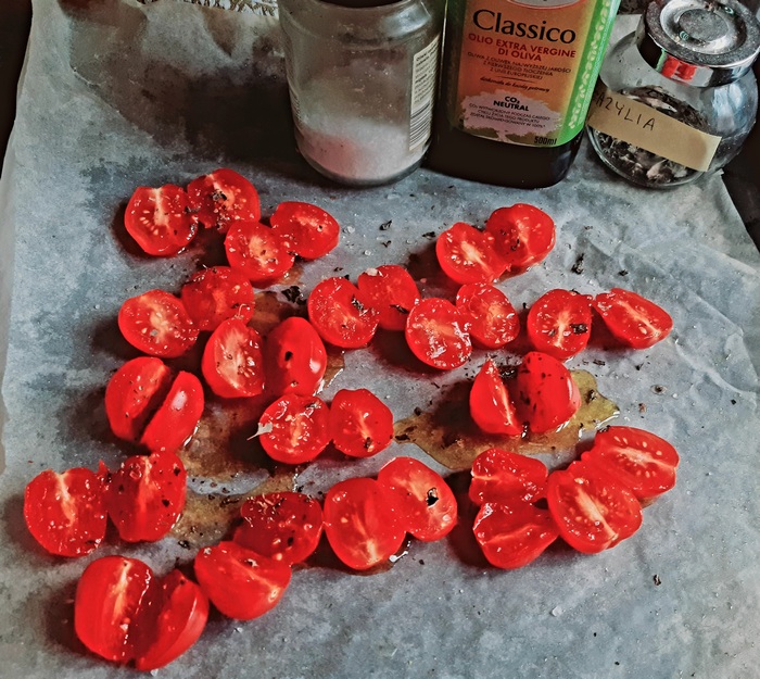 Takie konfitowane pomidorki są jak… konfitura (źródłosłów ten sam). Smakują wybornie na chałce lub drożdżowym cieście!
