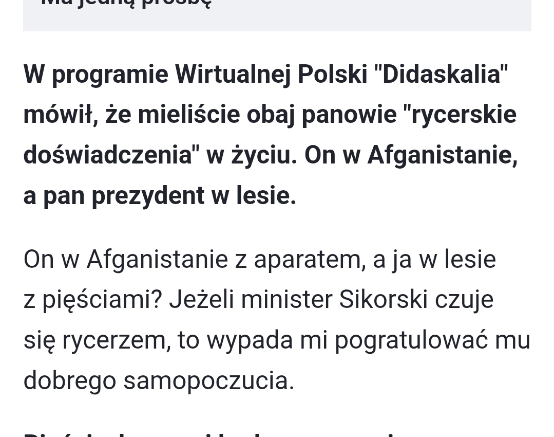 „w Afganistanie z aparatem, a ja w lesie z pięściami? Jeżeli minister Sikorski czuje się rycerzem, to wypada mi pogratulować mu dobrego samopoczucia”